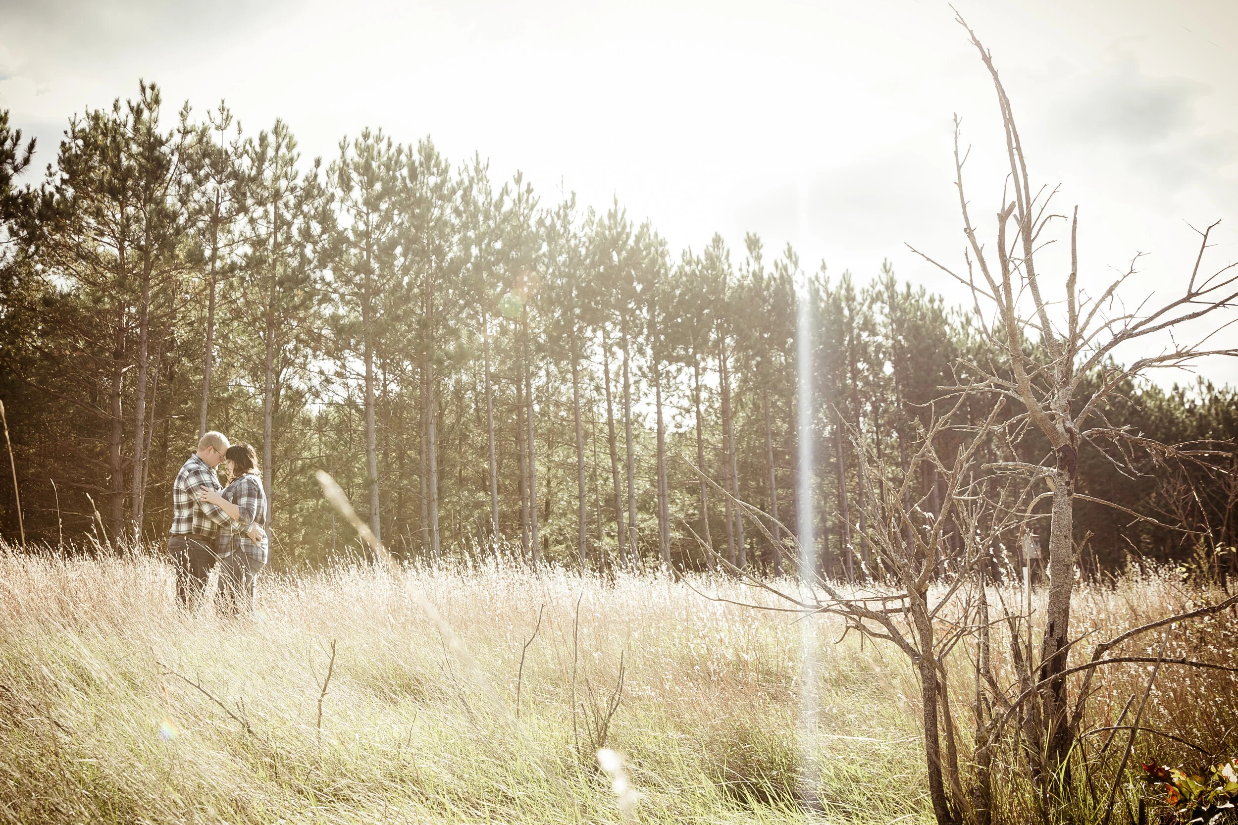 A couple embracing in a field with tall grass, trees in the background, and bright sunlight, creating a warm, romantic atmosphere.