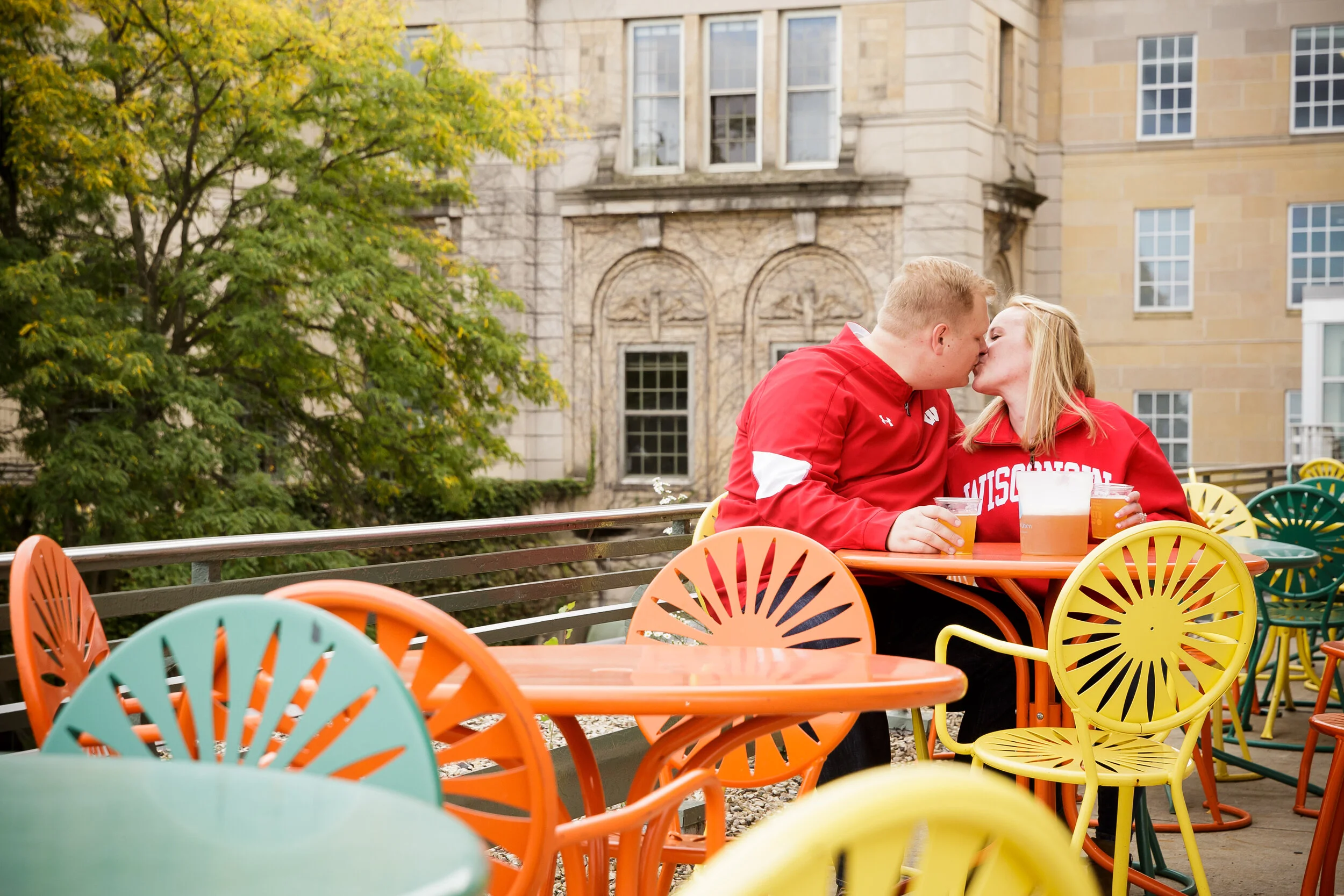 Couple in red Wisconsin jackets sharing a kiss and drinks on an outdoor patio with colorful chairs
